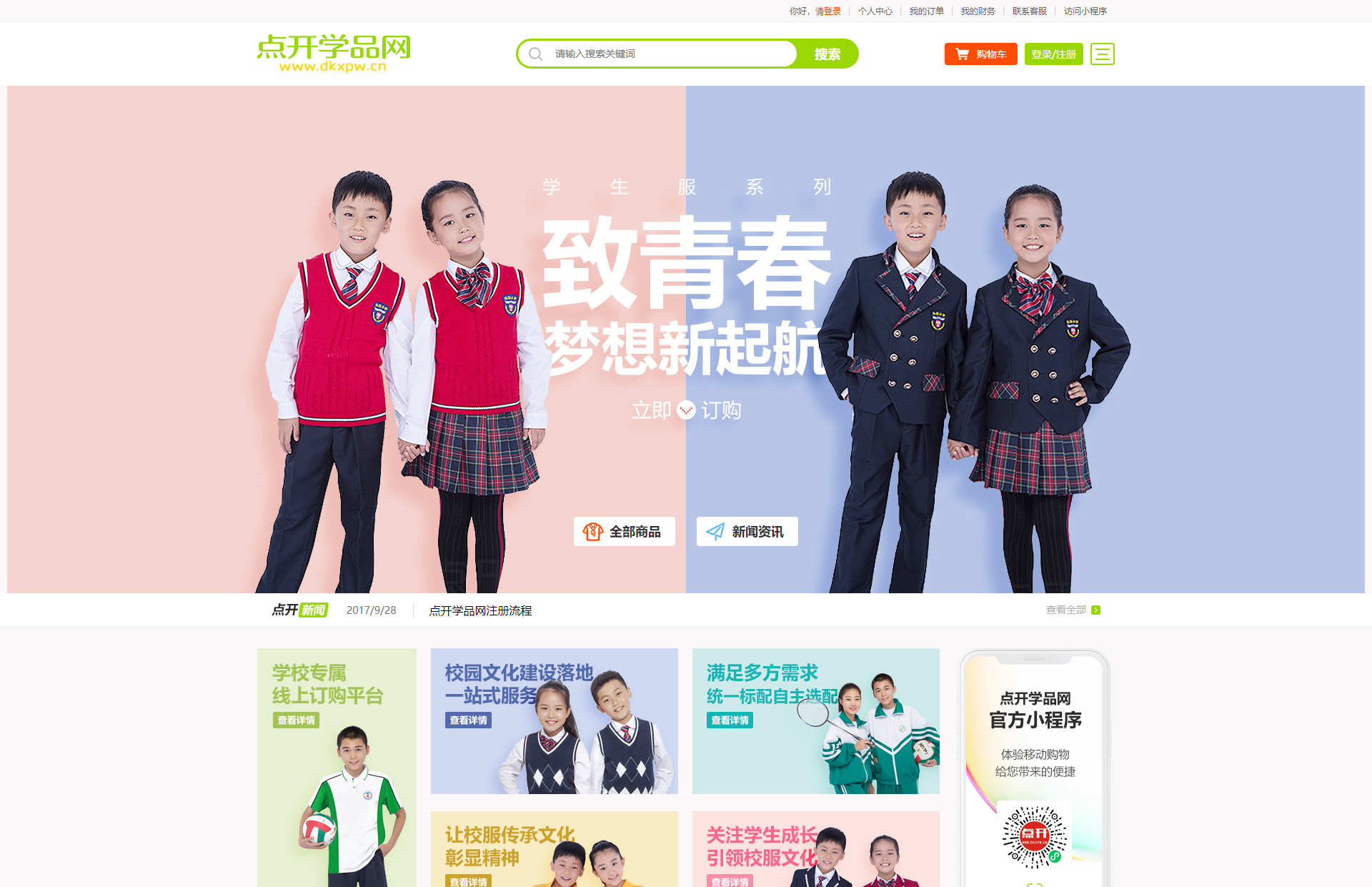 讓校服傳承文化,彰顯精神,關(guān)注學(xué)生成長(zhǎng),引領(lǐng)校服文化,校園文化建設(shè)落地一站式服務(wù),學(xué)校專(zhuān)屬線(xiàn)上訂購(gòu)平臺(tái),研發(fā) 生產(chǎn) 銷(xiāo)售 于一體,品質(zhì)精益求精 嚴(yán)把質(zhì)量細(xì)節(jié)。